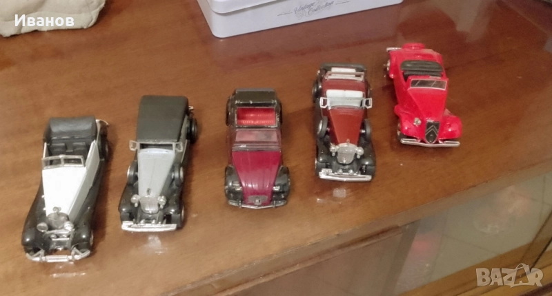 Предлагам ретро колички,пет на брой, всяка една по 18 лв., размер 1/43, Mercedes Cabriolet, Cadillac Phaeton. Citroen 2CV6, при закупуване на всички цена 90 лв. с подарък метална кутия и мини количка с часовник.