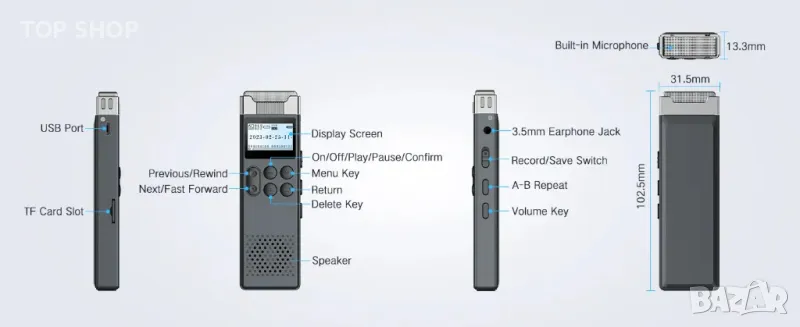 【Гъвкаво записващо устройство】 Този аудиорекордер за срещи има всички функции, от които се нуждаете, включително A-B повторение, редовно записване, циклично възпроизвеждане, стандартен 3,5 мм жак за слушалки, MP3 плейър, вграден високоговорител, поддръжка на 22 езика, запис във времето, MP3 /WMA формати, възпроизвеждане с променлива скорост, VOR режим, защита с парола, автоматично записване във времето, DSP чип за намаляване на шума и лесно прехвърляне на файлове. Това е най-доброто професионално записващо устройство, което отговаря на всички ваши нужди за запис.