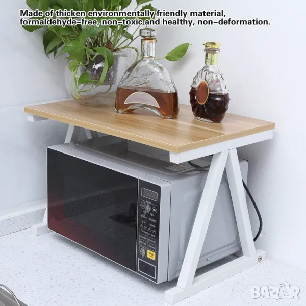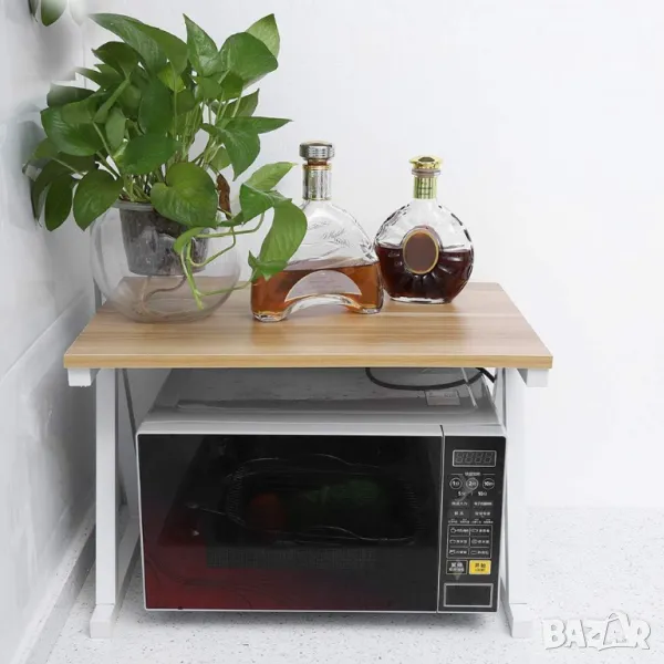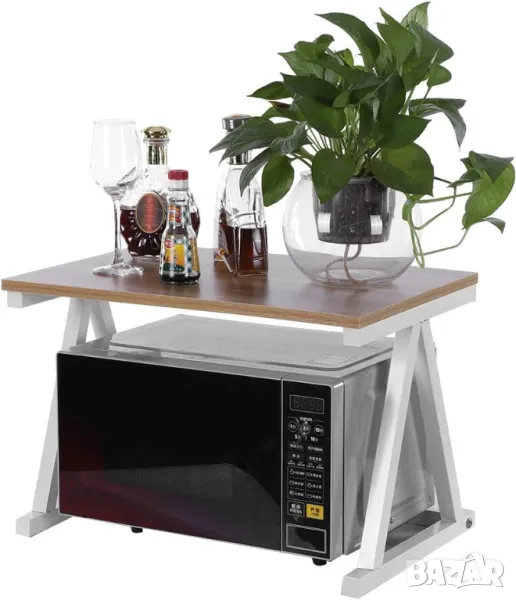 Дървена стойка за микровълнова фурна, рафт за кухненски плот на 2 нива, органайзер за спестяване на кухненско място, органайзер за плот на два слоя за принтери на бюрото, поставка за рафт за микровълнова фурна (бяла)