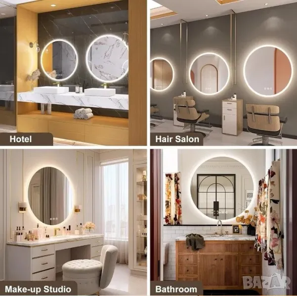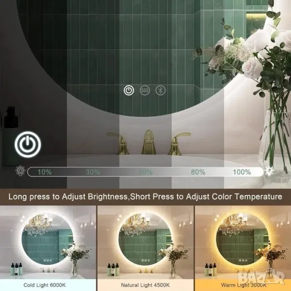 Кръгло огледало за баня с осветление 60/80 см диаметър с Bluetooth, димиране, 3 цветни температури, обезпотяване, функция за памет, IP44 огледало с осветление, полупрозрачна матирана рамка Марка: STARLEAD Тип стая: Баня Форма: Кръгло Размер: 60 × 60 /80 x 80 сантиметра Материал на рамката: Алуминий стил: Модерен 3 цветови температури и възможност за димиране: Огледало за баня STARLEAD кръгло с осветление 60/80см. 3 цветни температури на светлината 3000K-6500K, подходящи за всички тонове на кожата. Яркостта на светлината може да се регулира от 10% до 100%. Положителна мека светлина за защита на очите ви. Висококачествени 120 LED светлинни перли на метър, до 50 000+ часа живот. Против мъгла и Bluetooth: включете превключвателя за функцията мъгла, средата на кръглото огледало с осветление е частично нагрята, за да се осигури ясен огледален образ в средата на огледалото. Можете да нанесете грим или да се обръснете веднага след къпане. Огледалото е оборудвано с два Bluetooth високоговорителя на гърба. Докоснете Bluetooth превключвателя и го свържете и можете да слушате любимата си музика, докато се къпете. Водоустойчивост и 3 сензорни превключвателя: водоустойчивостта на LED лентата е IP65, а общата водоустойчивост на кръглото огледало за баня е IP44, което може да се използва в мокри бани. 3 отделни сензорни превключвателя. Докоснете стъклената повърхност на левия сензорен превключвател, за да превключите светлината на огледалото, да регулирате яркостта и да промените температурата на цвета. Средният бутон контролира размразяването, десният бутон Bluetooth. Безопасност и монтаж: висококачествено стъкло, чист и естествен дисплей, CRI>90. Взривозащитен филм на гърба на огледалото за баня с осветление, дори ако огледалото е счупено, то няма да се пръсне, за да се гарантира безопасността на вашето семейство. Огледалото е окабелено за монтаж и можете да го управлявате със стенен превключвател. За ваша безопасност ви препоръчваме да наемете професионален електротехник, който да го монтира. Спецификации на продукта:щ Тип монтаж: със стойка застена Тип покритие: полирано Специални свойства: Възможност за димиране, вграден Bluetooth високоговорител, обезпотяване, сензорен етикет с 3 бутона, 3 цветни температури. сензорни бутони Цвят: сребро ( с черна рамка, с дървесна рамка Материал: стъкло Рамка: да Размери: 60 х 60 х см; 10,5 килограма. Диаметър: 60/80 см