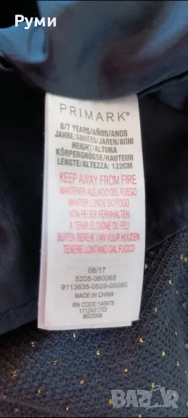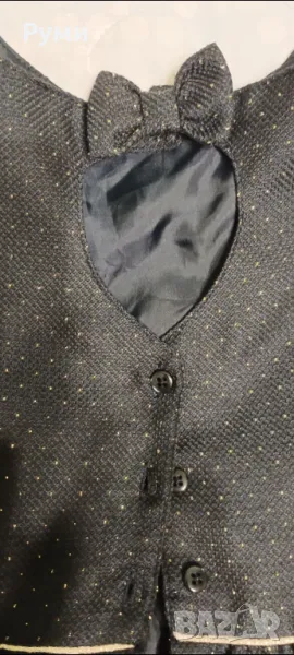Детска рокля с къс ръкав в тъмносин цвят.Роклята е с плат 97%полиестер и 3% втъкана метална нишка.Рязана е в талията.