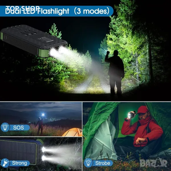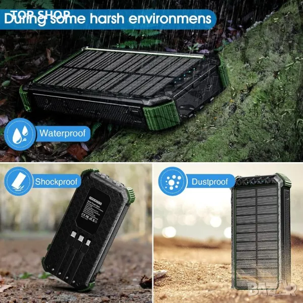 【Водоустойчивост IPX5 и 3 режима на осветление】 Външното зарядно устройство за слънчева батерия е изработено от издръжлив и надежден ABS+PC+силикон, слънчевият панел и портът за зареждане са защитени от висококачествен силикон, който е водоустойчив IPX5, прахоустойчив и устойчив на падане. Соларното преносимо зарядно има 2 вградени мощни LED светлини, които имат три режима: силна светлина-строб-SOS, особено подходящо за къмпинг, приключения на открито, туризъм, бизнес полет или други дейности на открито.