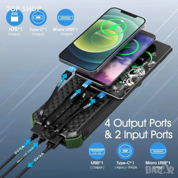 Power Bank 30000mAh, соларно зарядно устройство за телефон с 3 вградени кабела IPX5 водоустойчиво, соларно зарядно устройство за батерии с 4 изхода USB C двойни LED фенерчета за къмпинг на открито iPhone Samsung таблет