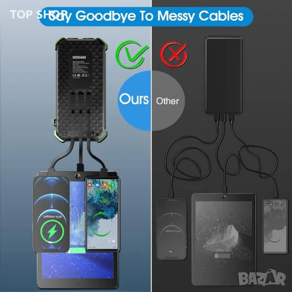 【Съвместим с ВСИЧКИ устройства】Слънчевата зарядна банка е подходяща не само за всички iPhone, телефони с Android, таблети, но и за вашите малки устройства. Например AirPods, Bluetooth слушалки, фитнес тракери, смарт часовници, персонални вентилатори за охлаждане, ръчни игри, музикални плейъри и всичко, което се зарежда с USB кабел.