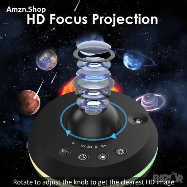 Този галактичен проектор за спалня поддържа завъртане на 180°, за да покрие тавана, стените или пода. И можете да регулирате фокуса чрез завъртане на обектива, за да получите по-ясна, цветна сцена на звездното небе. Пет групи лещи с висока пропускливост, 6500K богат източник на светлина, правят звезди разпръснати из стаята, внасят вълшебно светлинно шоу на галактика на закрито. Проекторът за нощно небе ще създаде страхотна атмосфера за сватби, рождени дни, партита, годишнини и др.