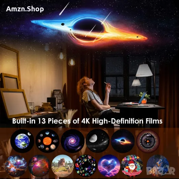 Galaxy проектор за деца и възрастни предлага ярки проекции на планети, галактики и мъглявини, които ще ви пренесат в един прекрасен свят! Този галактически светлинен проектор се предлага с 13 различни сценария за 4K HD дисплей: 1. Черна дупка 2. Коледа 3. Динозавър 4. Земя 5. Морски организъм 6. Луна 7. NGC 6357 8. Наблюдаема вселена 9. Стълбове на сътворението 10. Слънчева система 11. Млечният път 12. Мъглявината Орион 13. Свети Валентин ден.
