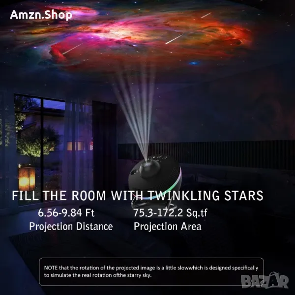 Поддържа настройка на разстоянието за прожектиране от 6,56 до 16,4 фута и площта на прожектиране от 269 кв. фута може напълно да покрие тавана или стената на стаята. Можете да създадете прекрасна галактика в стаята за романтично време или семейно време, високопрецизният обектив ви предоставя реалистично звездно небе, което можете да изпитате галактики и мъглявини у дома.