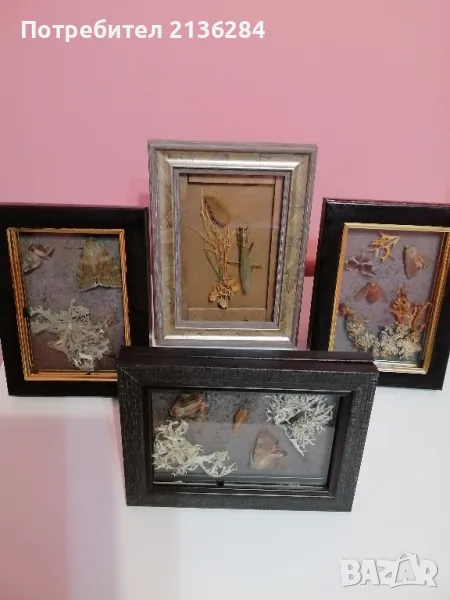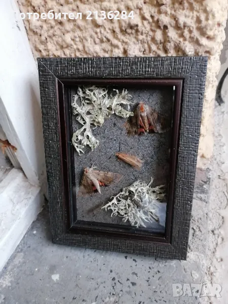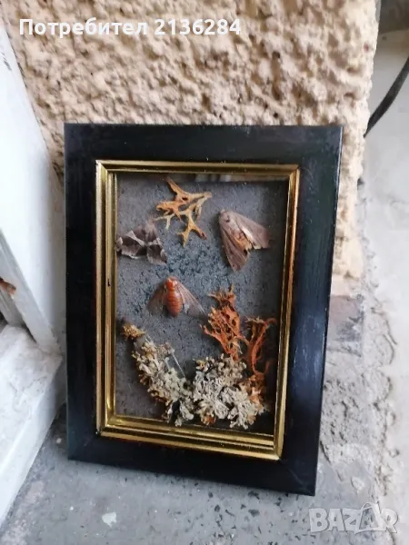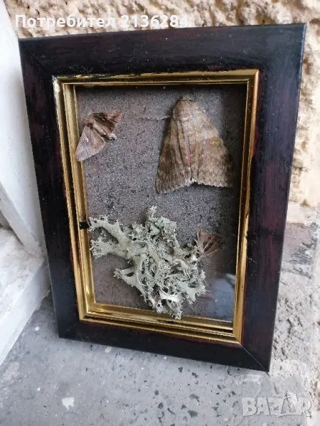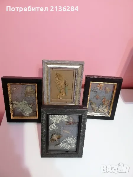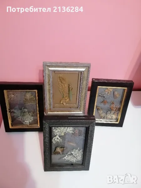 Ръчно изработени картини от естествени материали. Рамките са двойни, залепени, лишеи Ешеверия, пеперуди, цикада, богомолка(насекомите са естествени, но ги събрах в този вид,не съм им наредила).Рамки-16/12см и 18/13 см.