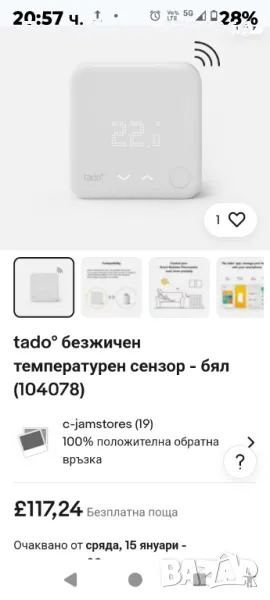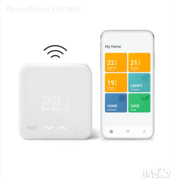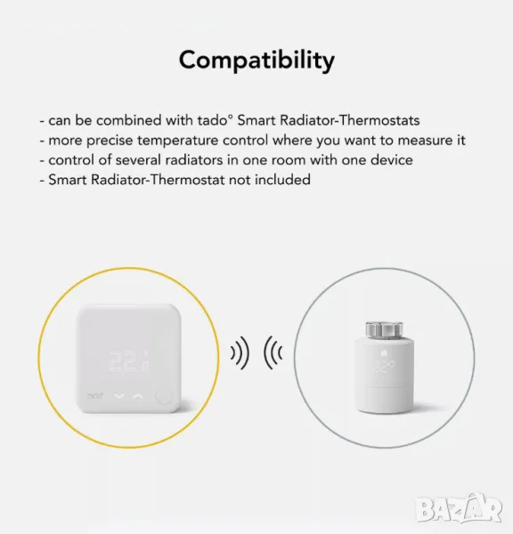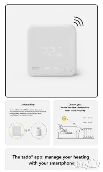 - ИЗИСКВАНИЯ: Съвместим с интелигентни радиаторни термостати tado°, изисква се стартов комплект tado° (V2, V3, V3+) с интернет мост (не е включен)