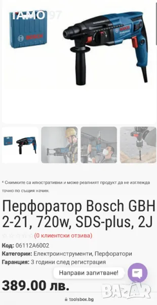 Продавам оригинален нов електрически перфоратор на Бош, който беше само като мостра на изложение на марката за демонстрация на модела. Не е работено по обектите нещо с машината и е на 100% оригинален може да се проверява със серийния номер, внос от Франция. Пращаме с опция преглед и тест с куриерска фирма еконт може и лично предаване за гр. Шумен. Магазинската цена е: 389лв