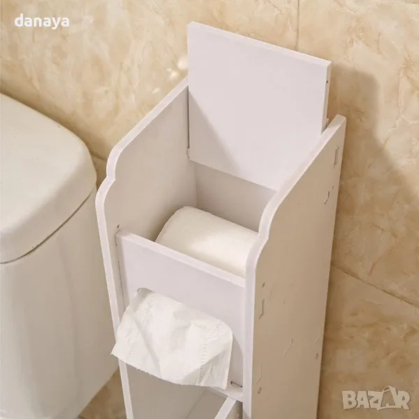 Като органайзер за баня и тоалетна, той практично ще съхранява тоалетните аксесоари, препарати, или кърпи. Има и специално отделение за тоалетна хартия или салфетки.