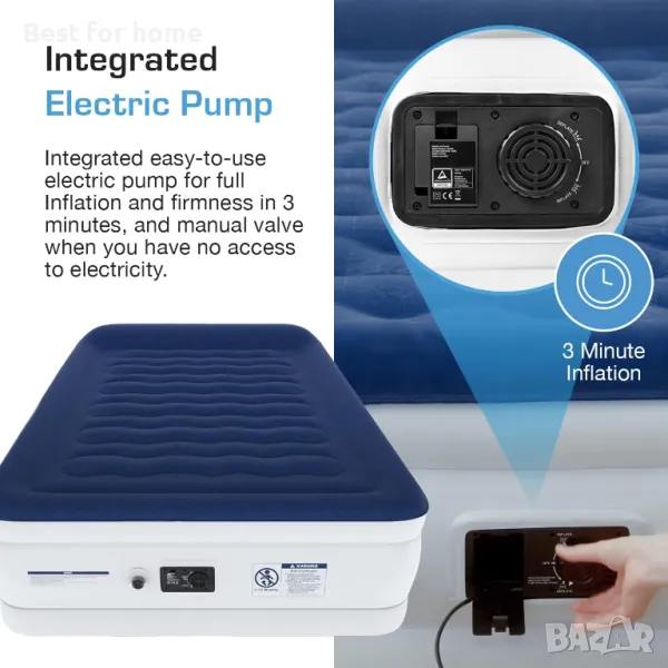 ВГРАДЕНА ЕЛЕКТРИЧЕСКА ПОМПА: Надуваемите легла Active Era с вградени електрически помпи бързо се надуват до пълна твърдост за 2 минути. С едно натискане на превключвател надуваемото легло ще се издуе автоматично, така че да може да се съхранява в малки пространства.