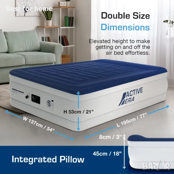 Спете по-добре с най-модерното въздушно легло на Active Era. Проектиран с вътрешна опорна структура, която имитира ламелите на традиционно легло, за да осигури ненадмината опора и комфорт през цялата нощ. Ергономичният му дизайн е подходящ за всички типове тяло, а повдигнатата височина от 56 см го прави изключително лесен за качване и сваляне. Освен това е вградена мощна помпа за пълно надуване за по-малко от 3 минути с интегрирана възглавница, която осигурява изключителна опора за главата и врата.