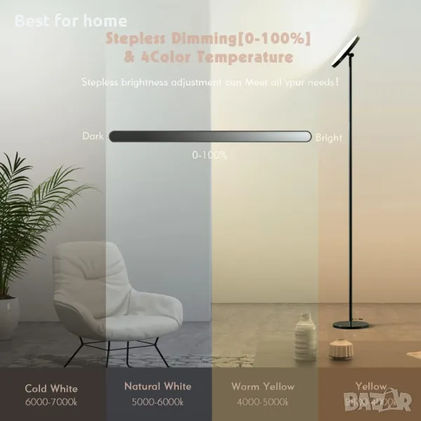 Тази по-висока подова лампа може да задоволи нуждите ви от осветление в рамките на 25-30 квадратни метра. безстепенно затъмняване и 4 различни регулируеми цветови температури: студено бяло, естествено бяло, топло жълто, жълто. Можете да избирате температурата и яркостта по ваше желание, отговаряйки на различните ви нужди от осветление.