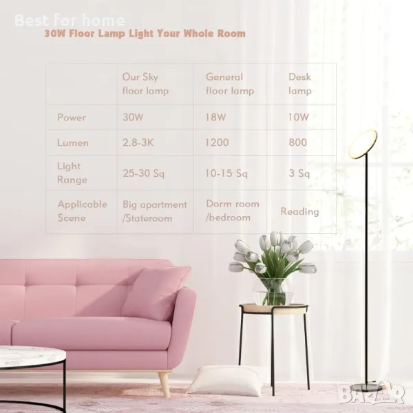 Осветените подови лампи за всекидневна са 30 W, 2800 лумена, равняващи се на 180 W крушка с нажежаема жичка, 40% по-ярки от другите подови лампи и настолни лампи (обикновените подови лампи или настолните лампи са само 8-15 W).