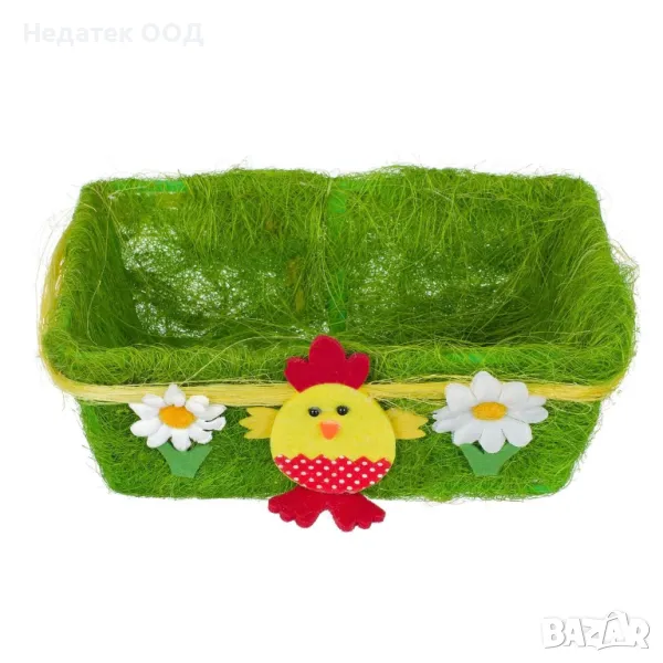 Великденска декоративна кошница, трева, зелено, украсено с цветя от филц и пиле.