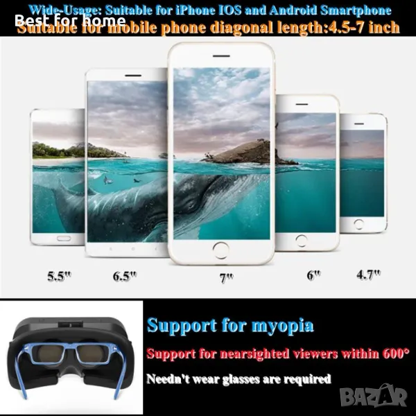 Различни видове смартфони на пазара могат да използват тази VR кутия, тъй като тази VR кутия може да се използва за смартфони с дължина на диагонала от 4,7 инча до 7 инча.