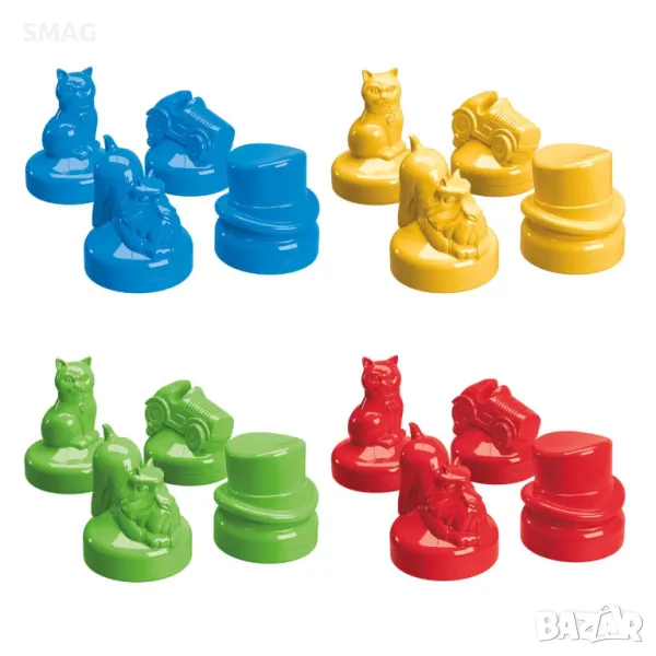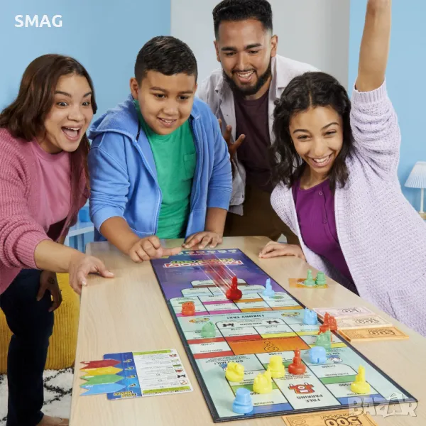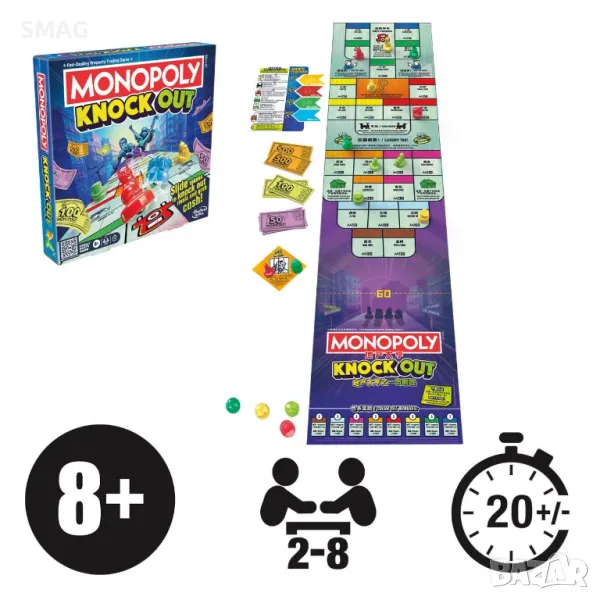 Плъзгайте чипове, за да нокаутите противници и да вземете пари в играта Monopoly Knockout! Лесна за научаване и забавна за овладяване, тази бърза игра на монопол в стил шафълборд, която се играе на кръгове, съчетава вълнуващо действие, умения и малко стратегия. Играчите плъзгат фигурите си по дългата игрална дъска, включваща любимите свойства на Monopoly и познати пространства. Насочете се към недвижими имоти, за да спечелите пари и да се опитате да хвърлите чиповете на опонента си в затвора, данък върху лукса или извън борда! Съберете най-много пари, за да спечелите! Включва: дъска за игра, 16 пластмасови плъзгащи се жетона (4 червени, 4 жълти, 4 зелени, 4 сини), 1 карта „В затвора“, 1 справочна карта, 4 маркера за завой (1 червен, 1 жълт, 1 зелен, 1 син) , пакет пари и ръководство за игри.