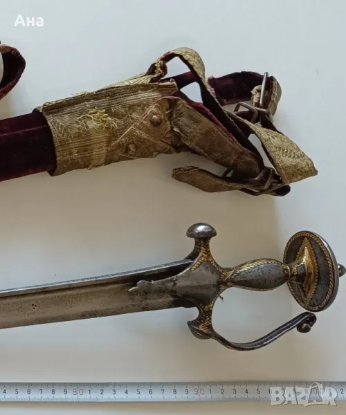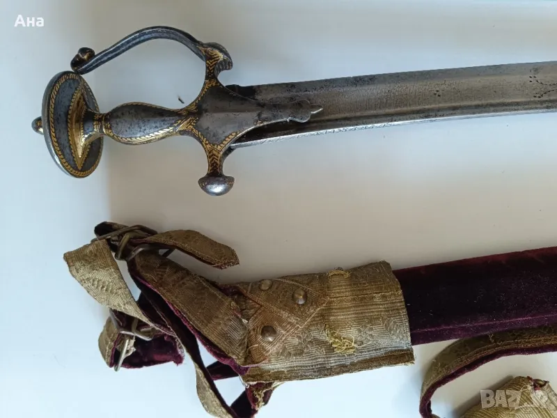 Сабя Тулвар от Северна Индия 19 век .Абсолютен боен оригинал на Индийско острие.Ръчно ковано извито острие с един канал от стомана , маркирано и дръжка със златни инкрустации.Без видими щети .Дръжката на Тулвара е направена в национален Индийски стил "Делишахи" Дръжката е със сложна многоделна инкрустация от злато.Дървена оригинална кания от плюш и сърма , и сърмен колан с множество инкрустации по него .