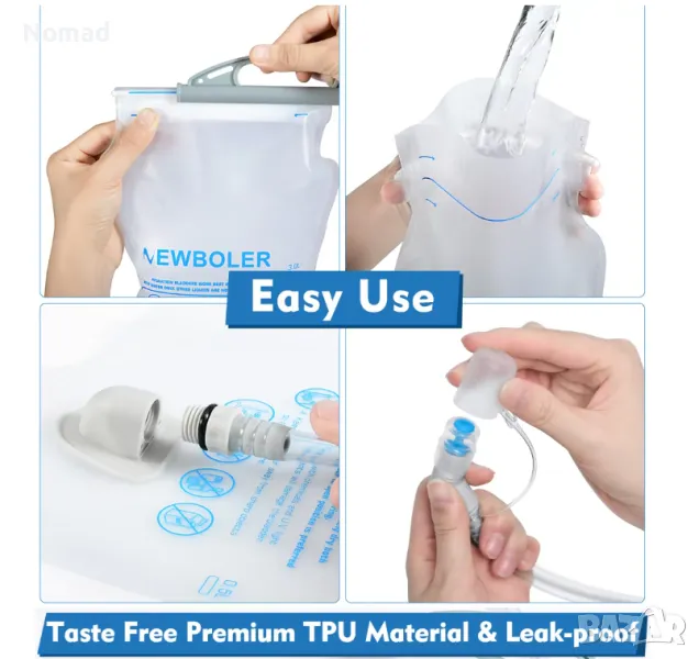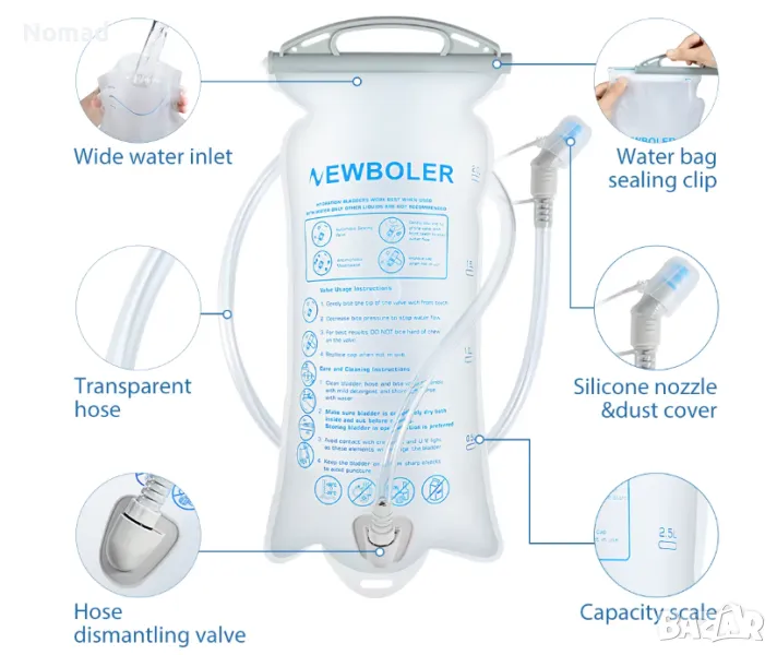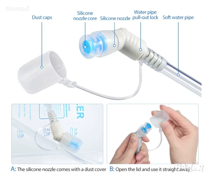 - Маркуч с дължина 105 сантиметра, който е съвместим с повечето раници със странични изходи