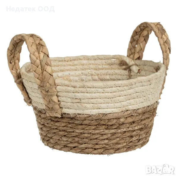 Кръгла кошница за съхранение от 100% царевични влакна в кафяв и бежов цвят с къси дръжки.