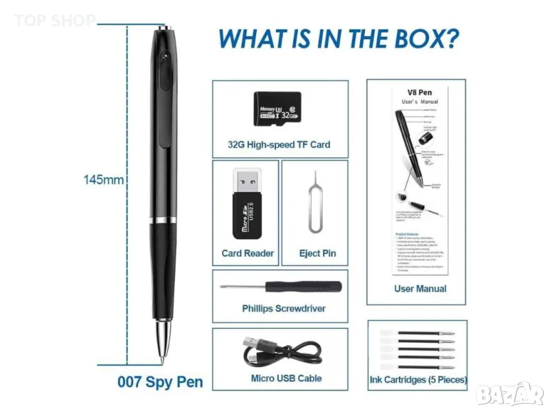 Камерата е инсталирана в луксозна метална писалка. Писалката е истинска с комплект резервни пълнители.