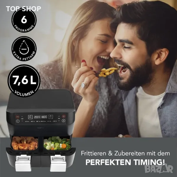 Фритюрник с горещ въздух MAXXMEE Двойна кошница 7,6 литра Цифров двоен фритюрник с горещ въздух с две камери 2 x 3,8 литра, едновременно готвене на 2 различни ястия 6 програми [2400 вата]