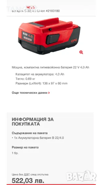 Продавам акумулаторна литиево-йонна батерия на хилти 22V 4.0Ah с индикатор за машини и инструменти работещи с 22V батерии от серията B22. Батерията е в отлично визуално състояние, също така зарежда се до край без проблем и държи заряд перфектно, оригинално полско производство от 2022г. внос от Франция. Пращаме с опция преглед и тест с куриерска фирма еконт, може и лично предаване за гр. Шумен.