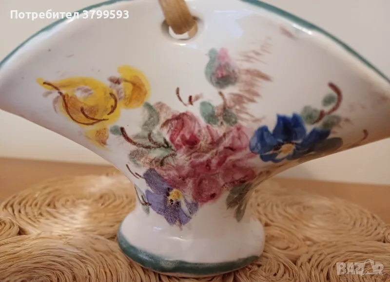 Ръчно рисувана керамична кошничка, с ратанова дръжка. Ширина-13.3 см, височина без дръжката-7.8 см. Без забележки.