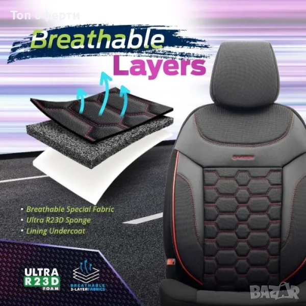 Дишаща материя: Благодарение на 3-слойной дишаща материя, която предпазва от изпотяване дори при дълги пътувания и подобрява комфорта при шофиране. Страничните опори, които предпазват от болка, създавайки специална форма за кръста и гърба.