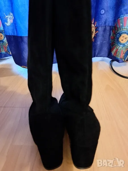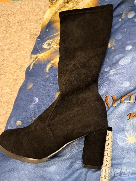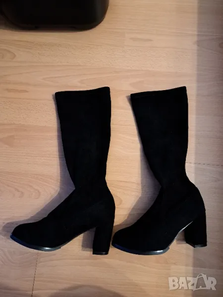 Черни дамски ботуши от изкуствен велур (разтеглив плат-стреч). Токчето е 8 см, а от долната част на токчето до горе е 45см. Материята позволява и да се набират. Стават и за 36 номер със стелка или малко по-дебел чорап. Не са подходящи за дъжд и сняг! Чисто нови са!
