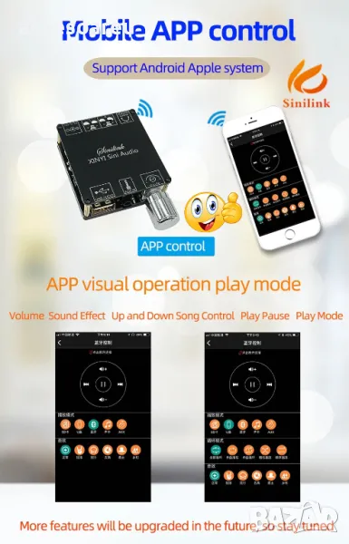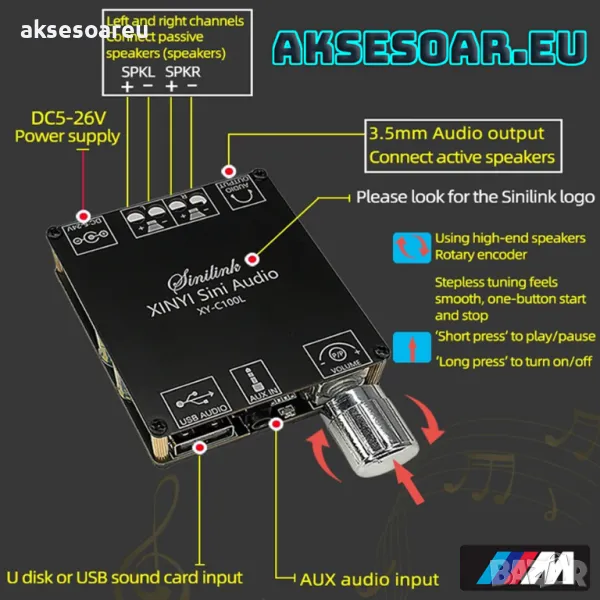 двуканално стерео качество на звука с входно напрежение DC5~27V (аудио входът поддържа Bluetooth, AUX, USB)може да бъде директно