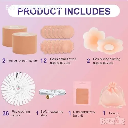 Комплектът включва: 14 бр. покрития за зърна (2 силиконови), 2 бр. ленти за бюст, 36 бр. двойнозалепващи ленти, мерителна лента и практична чантичка.