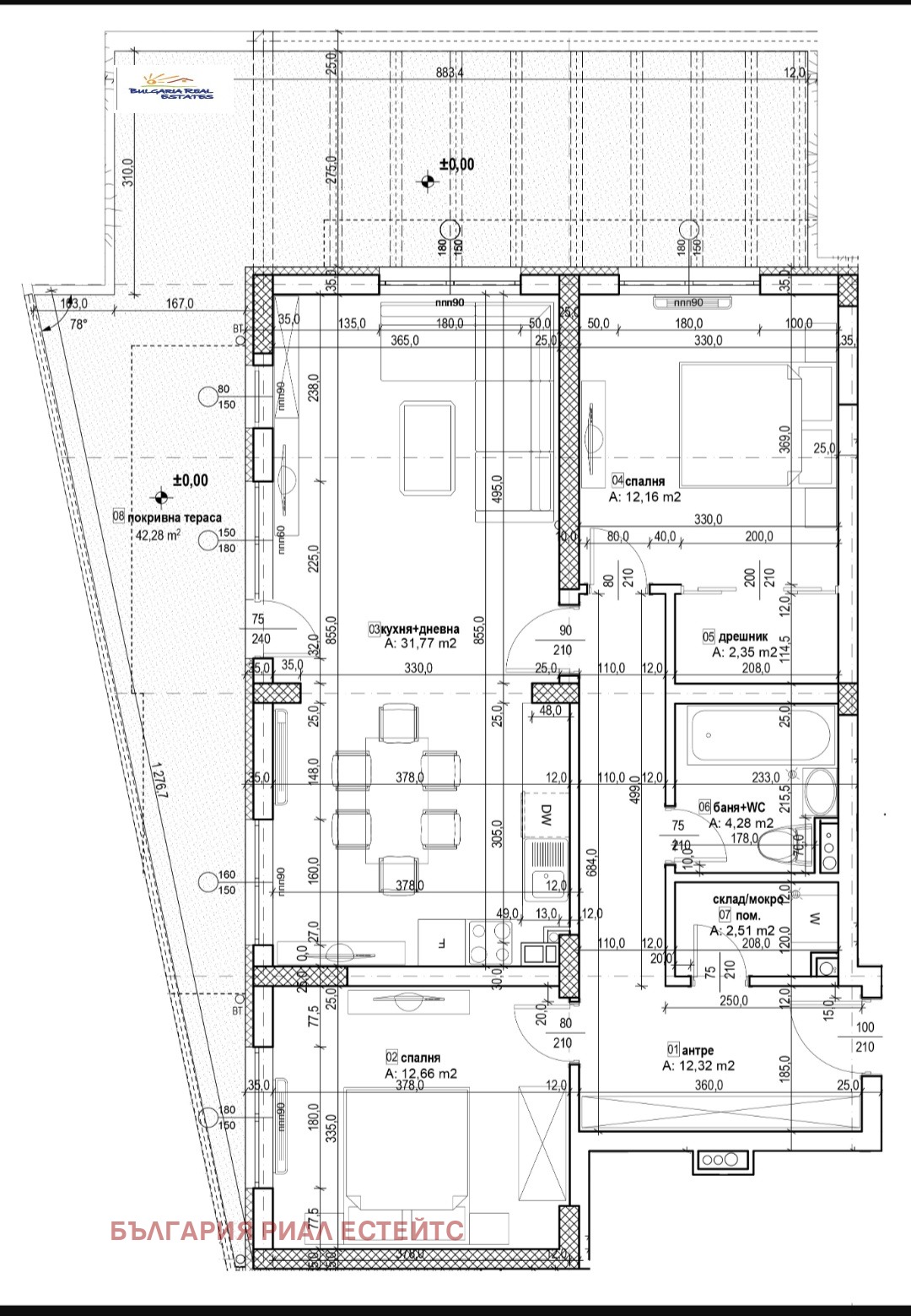Представяме Ви апартамент състоящ се от антре, склад, тоалетна за гости, спалня с баня/тоалетна към нея, кухня с трапезария и дневна, панорамна тераса с излаз от дневна и спалня, още две спални с тераса към тях, втора баня и тоалетна...светли и просторни помещения.