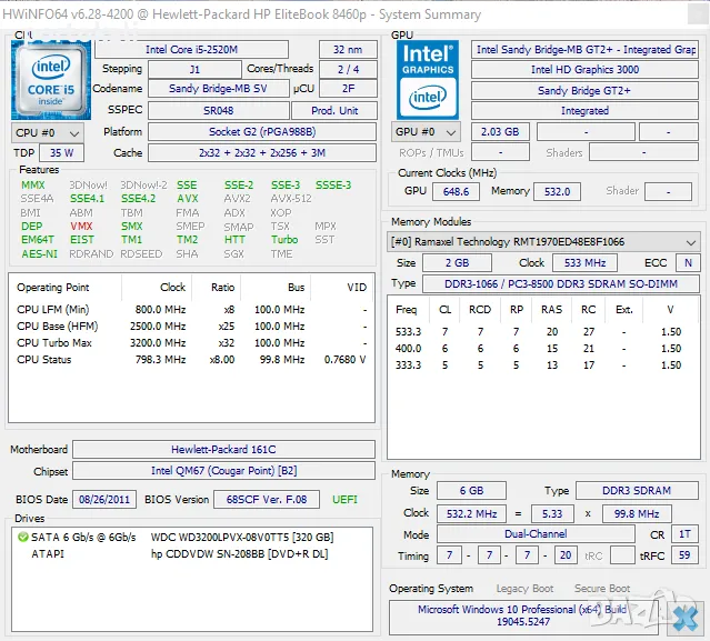 Hp Elitebook 8460p Intel Core i5-2520M / 6GB RAM / 320GB HDD