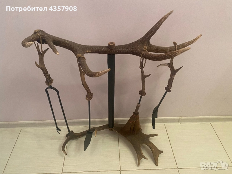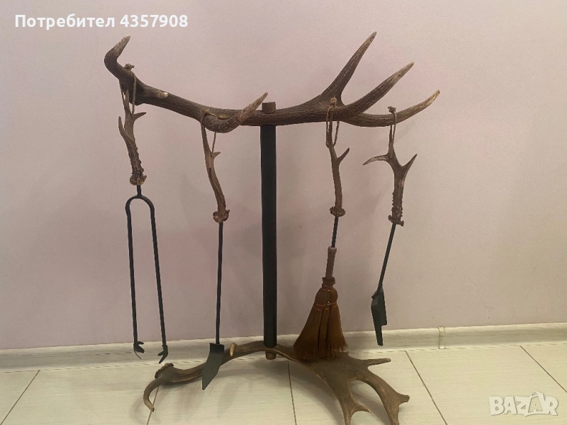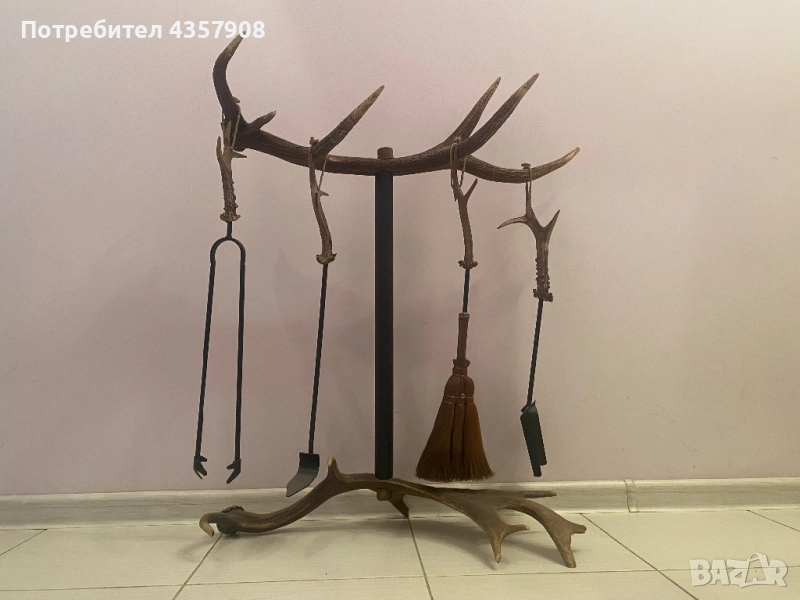Стойка с аксесоари за камина изработена от рог на Елен лопатар и благороден Елен и дръжки от рога на сърна