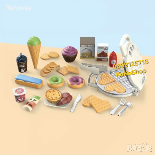 Забавен детски комплект за гофрети и сладки. Комплектът съдържа различни вкусни лакомства,чиния и прибори за хранене,"съставки" за гофретите,напитки,щипка и уред за гофрети,който е със звук и светлини.