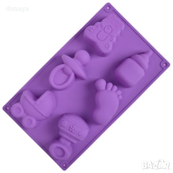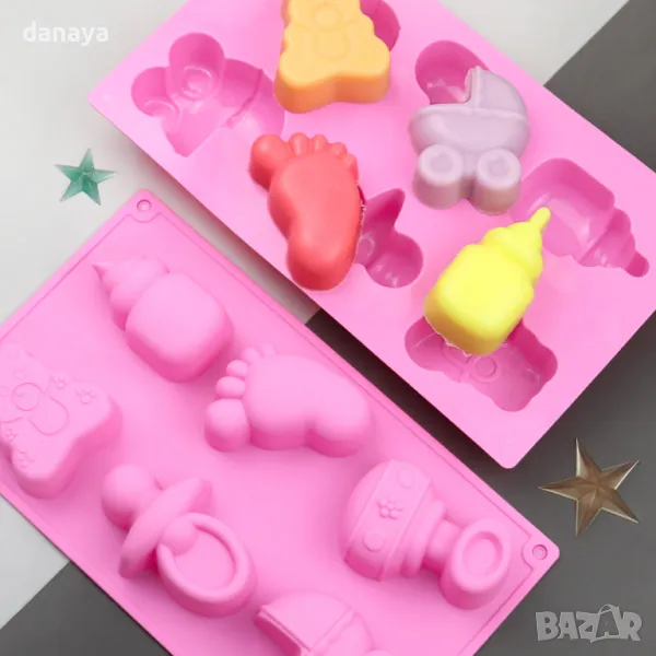 Силиконов молд бебе форма за мъфини с бебешки формички. Създайте уникални и очарователни сладки изкушения с тази силиконова молд форма за бебе! С 6 различни гнезда – мече, шише с мляко, биберон, краче, бебешка количка и дрънкалка – тази форма е перфектна за различни творчески проекти. Всяка форма е с приблизителен размер 7×6 см, което я прави идеална за изработка на: