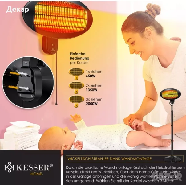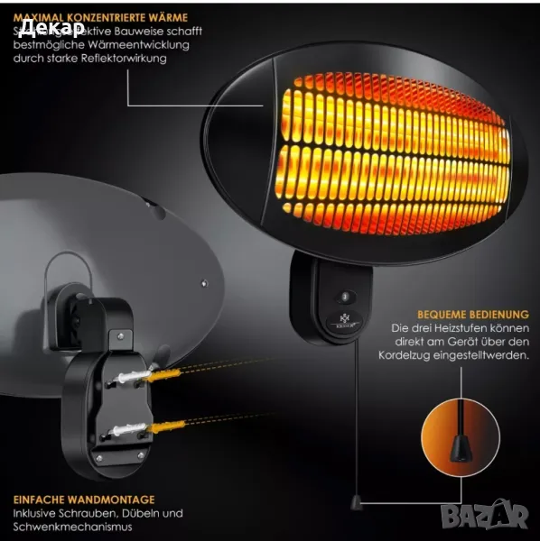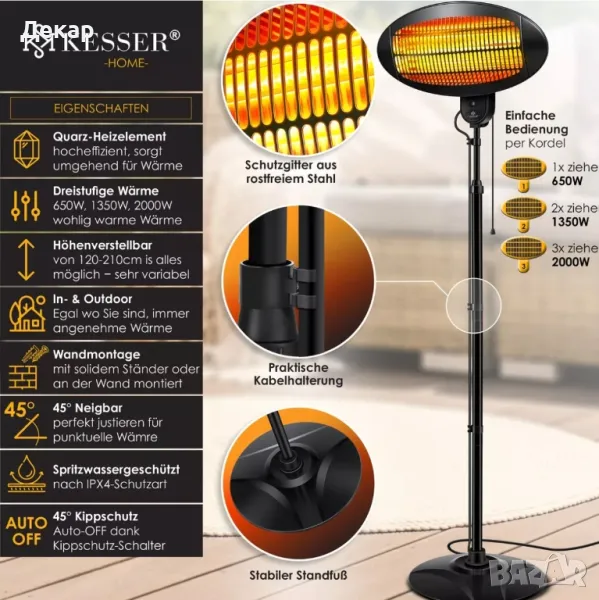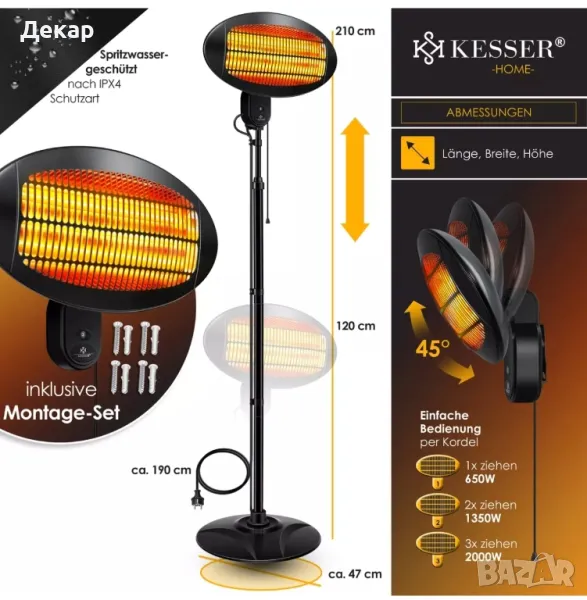 Този красив и мощен инфрачервен нагревател впечатлява с мощност от 2000 вата. Въпреки добрата си отоплителна мощност, той е компактен и променлив - така че нищо не пречи на широката гама от приложения в къщата, гаража или дори в градинските навеси или на терасата. подробности - Регулиране на височината от около 120-210 см - 45 градуса накланяне - здрав статив (разтегателен и лесен за използване) - регулируема температура на 3 нива (650w, 1350w, 2000w) - 3 кварцови нагревателни елемента - Клас на защита IPX4: устойчив на пръски - незабавно развитие на топлина - много ефективен благодарение на инфрачервената топлина - Може да се използва на закрито и на открито - Защитна решетка от неръждаема стомана - със стенен държач на гърба за лесно монтиране на стена - За ваша безопасност, устройството има и вграден превключвател Технически детайли -Мрежова връзка: 230 волта / 50Hz - Максимална мощност: 2000 вата - Дължина на кабела: приблизително 190 см - Размер на сенника Ш х В: 50 х 26 см - Височина на статива: 120 – 210 см - Стойка за метална основа: Ø 47 прибл - Приблизително тегло: 9 кг Обхват на доставка 1x инфрачервен нагревател 3x стойки 1x подова основа 1x ръководство за употреба (ЛИПСВА)