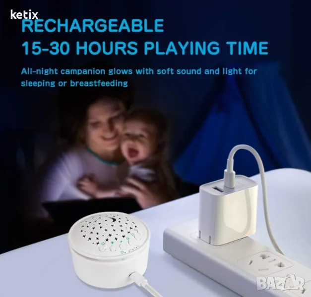 - Перфектен спътник при пътуване, С висяща закопчалка, бебешката залъгалка с бял шум може лесно да бъде прикрепена към креватче, столче за кола или столче. Зарежда се. Просто включете USB кабела, когато захранването свърши.