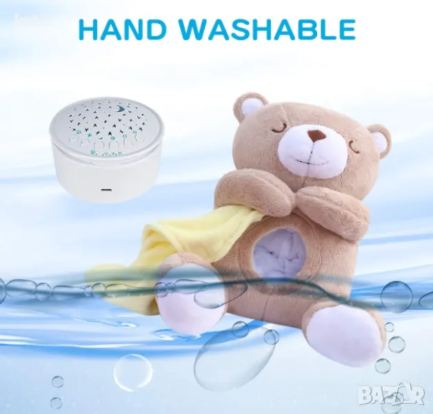 - Мие се на ръка/Таймер за автоматично изключване-/Регулируема сила на звука, Отстранете звуковата кутия за лесно почистване, когато се замърси; Настройте бебешката залъгалка да изключва звука и/или светлината след 15, 30, 60 минути, за да избегнете събуждане на бебето, докато я изключвате отново; Регулируемото ниво на звука ви позволява да изберете идеалния звук, който работи за вашето бебе.