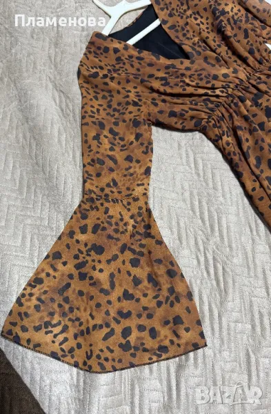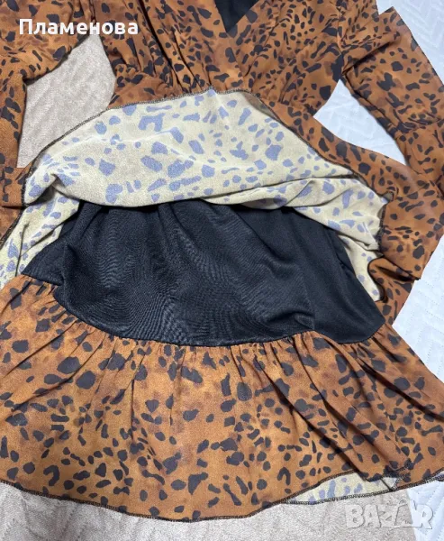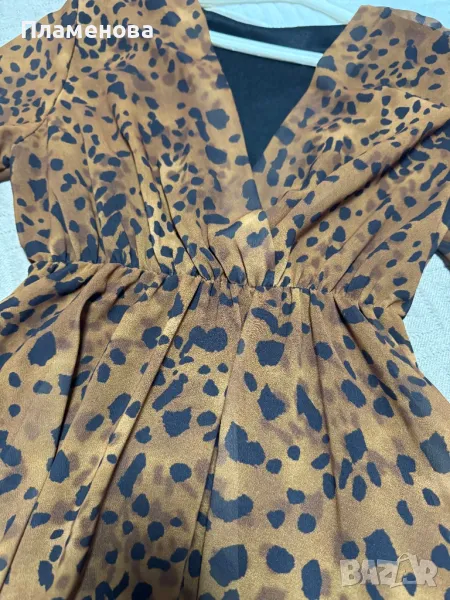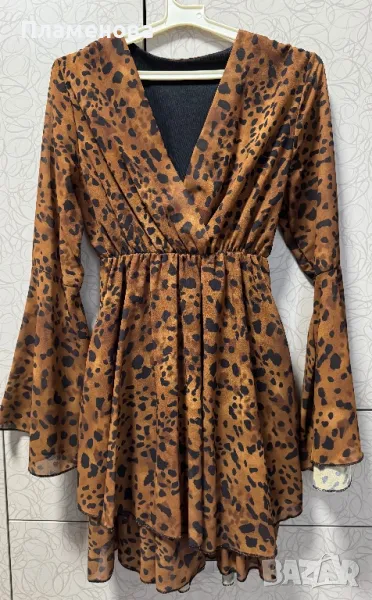 Рокля с тигров принт, широк ръкав и ластик в кръста. Има подплата. Обличана веднъж, като нова. Размер стандартен, подходящ за S, M, L. Цена - 40 лв.