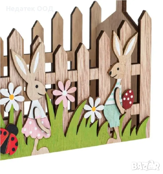 Великденска декоративна дървена кошница за ограда, с фигури на зайчета, калинки и пеперуди.