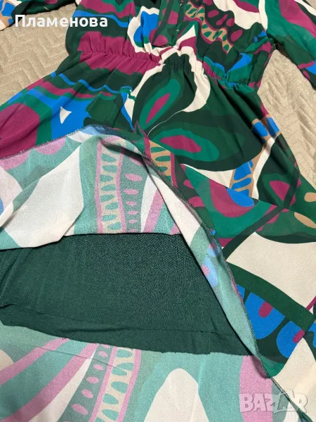 Цветна рокля с ластик в кръста. Прозрачни ръкави, има подплата и надолу не прозира.