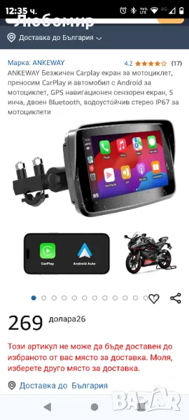 Carplay екран за мотоциклет, преносим CarPlay и автомобил с Android за мотоциклет, GPS навигационен сензорен екран, 5 инча, двоен Bluetooth, водоустойчив стерео IP67 за мотоциклети.Подобрете изживяването си при каране с нашия сензорен екран за мотоциклети, който предлага CarPlay и Android Auto. Свържете вашия смартфон безжично чрез Bluetooth за достъп до навигация, провеждане на разговори, възпроизвеждане на музика, изпращане на текстови съобщения и много повече, като същевременно държите ръцете си свободни за по-безопасно шофиране.Оборудван с двоен Bluetooth, сензорният екран на мотоциклет ANKEWAY ви позволява безпроблемно да свържете както вашия смартфон, така и вашия шлем или Bluetooth слушалки. Наслаждавайте се на разговори със свободни ръце и любимите си песни, без да е необходимо да сваляте каската си, като пазите телефона си в безопасност.Насладете се на ясно и бързо реагиращо управление чрез докосване с нашия 5-инчов IPS сензорен екран с висока разделителна способност. Екранът предлага разделителна способност от 1024x600 за превъзходна визуална яснота, подобрявайки взаимодействието ви с устройството в движение.Този универсален сензорен екран CarPlay е съвместим с всички модели мотоциклети и включва монтажен комплект и инструменти за лесно монтиране. Здравата монтажна система и винтовете осигуряват сигурен монтаж. Забележка: Ограничена съвместимост със серията Samsung Note и S. Моля, потвърдете, че телефонът ви поддържа CarPlay или Android Auto безжично преди покупка.Създаден да издържа на всякакви метеорологични условия, рейтингът IP67 гарантира, че сензорният екран на нашия мотоциклет работи перфектно както при дъжд, така и при слънце. Подвижният дизайн на стойката против кражба добавя допълнителен слой сигурност, осигурявайки ви спокойствие при различни условия. Уредът работи безпроблемно в температурен диапазон от -20°C до 70°C.