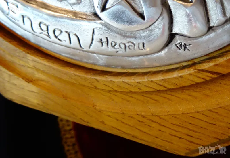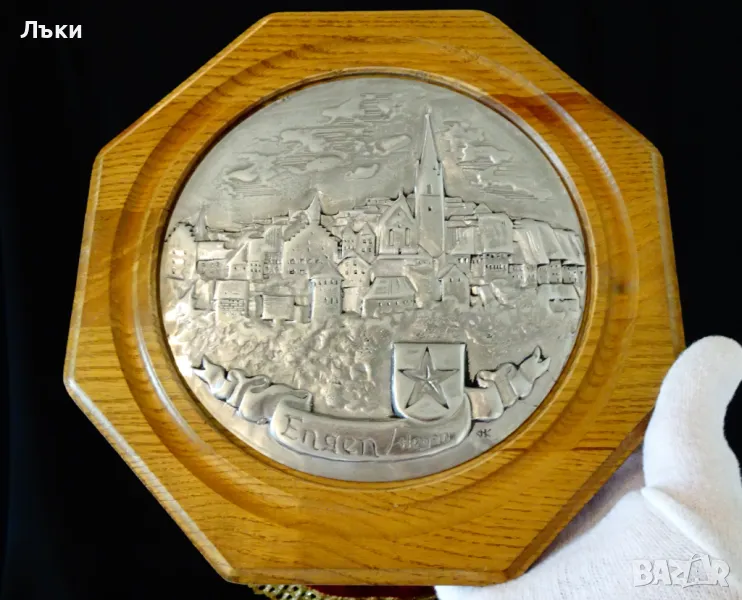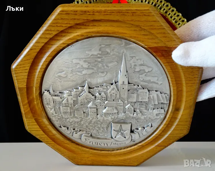 изработка от 95% калай и 5% сребро.В центъра има прецизно изваян релефен изглед от град Енген с подпис на автора,поставен в красива осмоъгълна рамка от