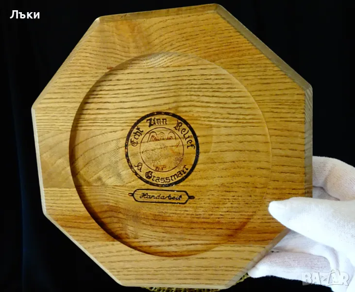 естествено дърво-немски дъб.Паното е маркирано от производителя,като патентован модел.Високо качество със сребърен блясък.Диаметър 22 см.,диаметър на калаената