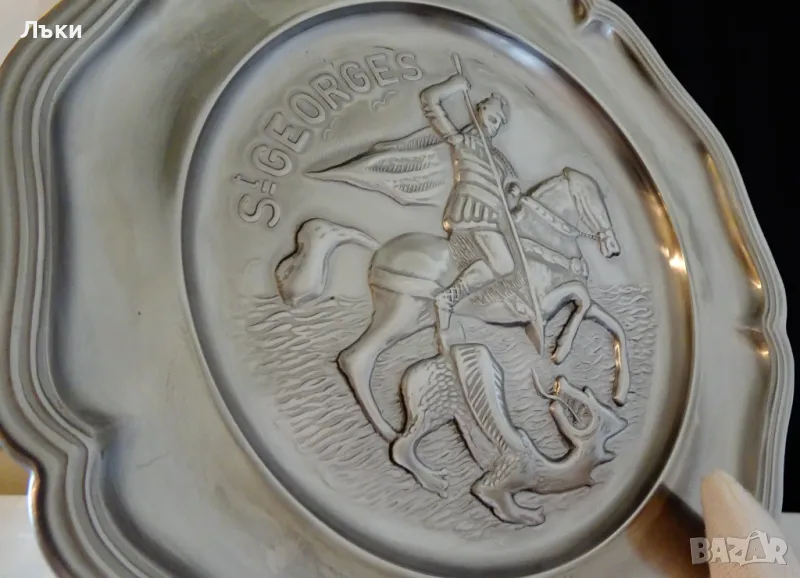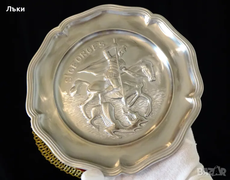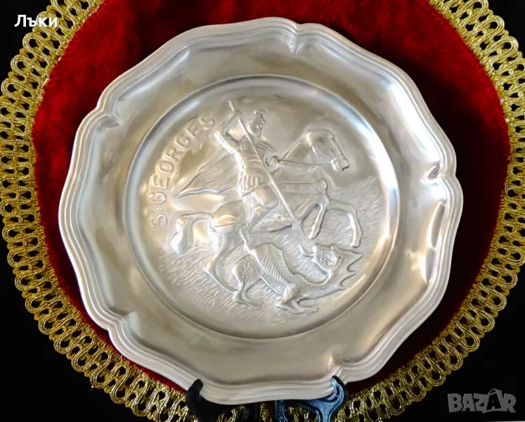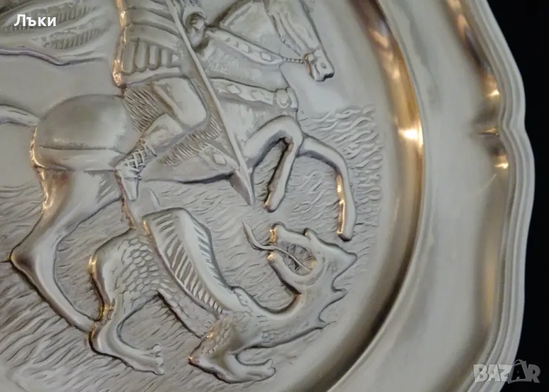 качество,масивност и сребърен блясък.Диаметър 23.5 см.,височина 1.8 см.,тегло