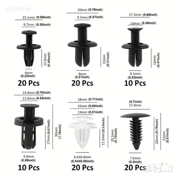 Тези скоби са идеални за фиксиране и монтиране на различни автомобилни компоненти, като панели на вратите, спойлери, предпазни плочи и много други. Комплектът предлага практични и бързи решения за всякакъв вид ремонт на автомобили, като е незаменим инструмент за всеки собственик на автомобил или специалист по ремонт на автомобили.