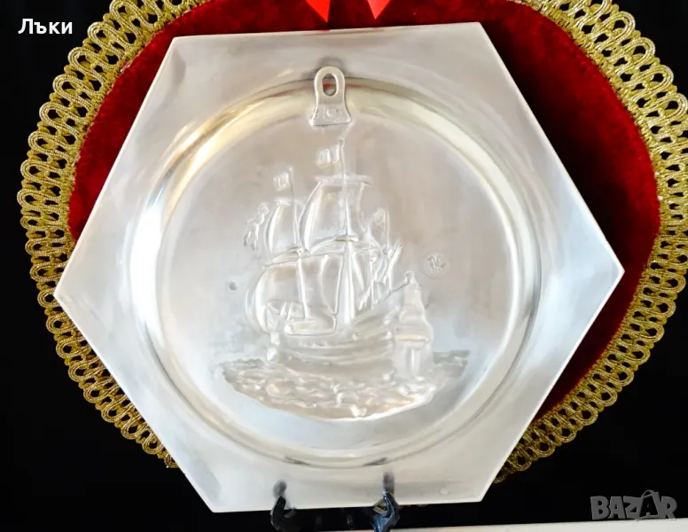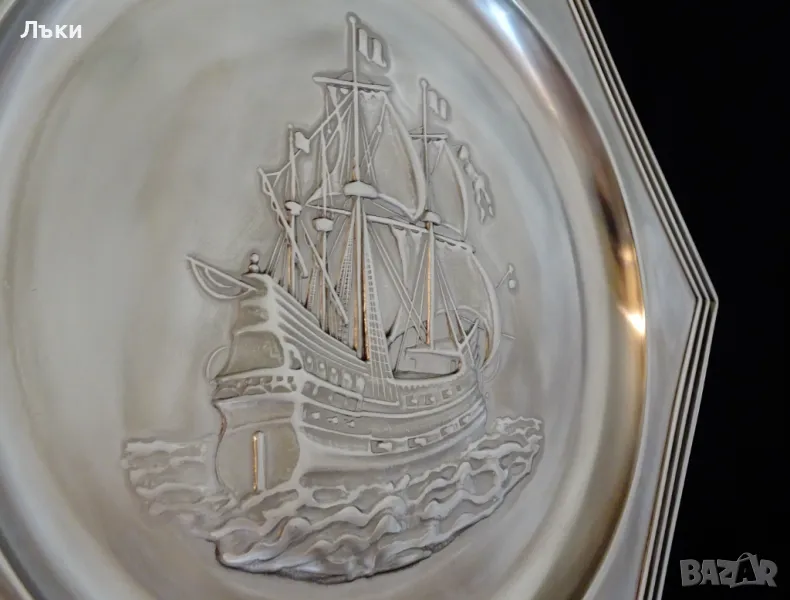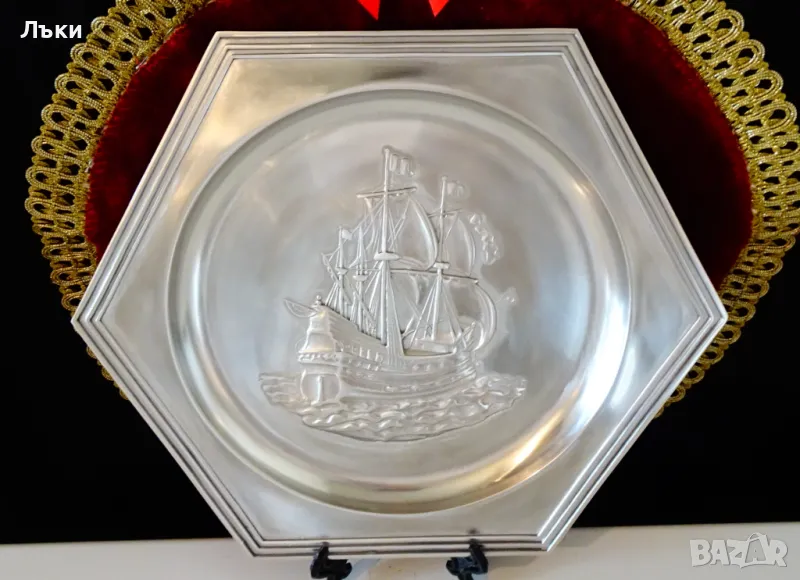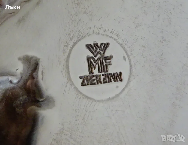 ръчна изработка от 95% калай и 5% сребро,маркирано с инициалите на световно известната западно германска марка WMF.В центъра има прецизно изваяно релефно изображение на